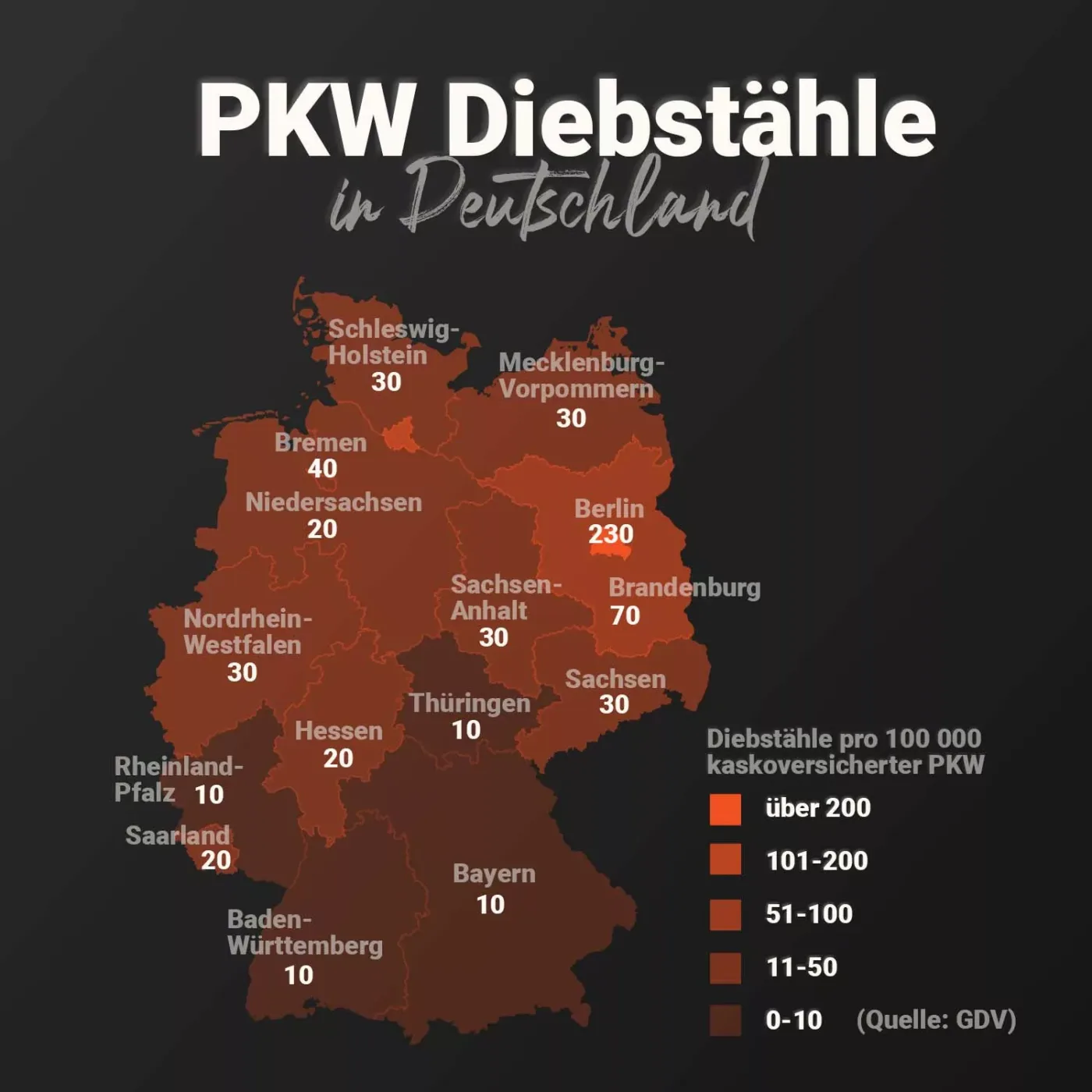 Wie der GDV (Gesamtverband der Deutschen Versicherungswirtschaft) meldet wurden 2021 über 10.000 PKW gestohlen. Auch wenn die Zahlen der Autodiebstähle 2021 zum Vorjahr zurückgegangen sind, sind diese immer noch erschreckend hoch. In Berlin waren es die meisten mit 2.267 gestohlenen KFZ und auf Platz 2 befindet sich Hamburg mit 769 entwendeten Autos. Die beliebtesten PKW für Autodiebe sind VW, Audi und BMW. Alleine diese Automarken machen etwa 45 % der gestohlenen Fahrzeuge aus. Weitere Informationen