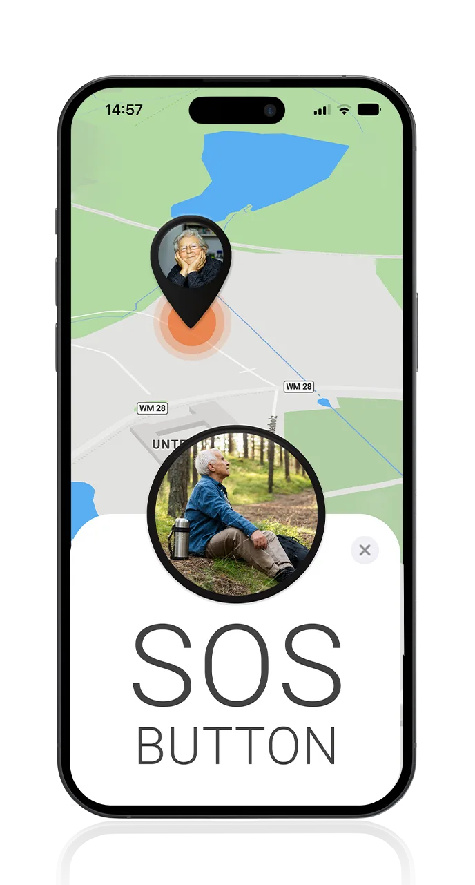 Wenn der Fall eintritt, dass sich die Person verläuft, nicht weiß, wo sie sich befindet oder wie sie wieder nach Hause kommt, kann durch den SOS-Knopf ein Alarm an Sie gesendet werden. Sie erhalten dann in der kostenlosen App oder im Portal eine Information mit Standpunkt und können so Ihr Familienmitglied leicht wiederfinden und nach Hause begleiten.